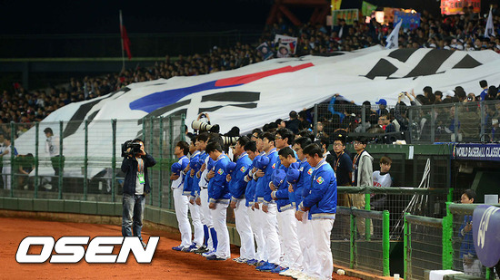 5일 오후 대만 타이중 인터컨티넨탈구장에서 2013 WBC 1라운드 B조 한국과 대만의 경기, 경기에 앞서 양팀 국가가 연주되고 있다