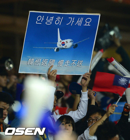 5일 오후 대만 타이중 인터컨티넨탈구장에서 2013 WBC 1라운드 B조 한국과 대만의 경기, 경기에 앞서 대만 야구팬이 한국 대표팀을 자극하는 문구 피켓으로 응원하고 있다