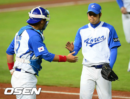 5일 오후 대만 타이중 인터컨티넨탈구장에서 2013 WBC 1라운드 B조 한국과 대만의 경기, 1회초 대만 공격을 무실점으로 막은 장원준 선발투수와 강민호가 하이파이브를 하며 더그아웃으로 들어가고 있다