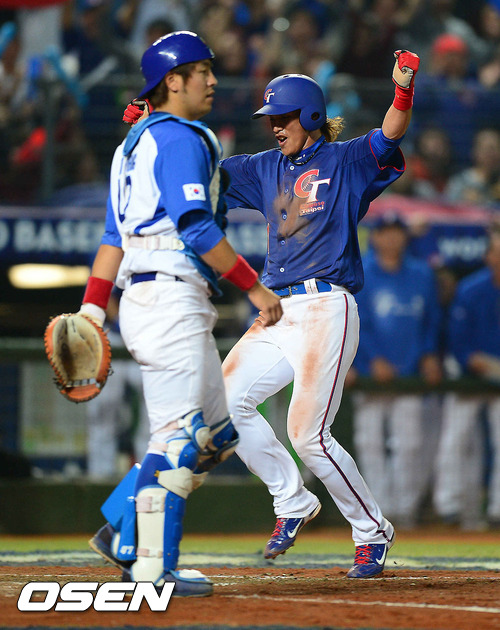 5일 오후 대만 타이중 인터컨티넨탈구장에서 2013 WBC 1라운드 B조 한국과 대만의 경기, 3회초 2사 1루 린즈셩의 안타때 1루 주자 양다이강이 수비 실책을 틈타 선취 득점을 올리고 있다