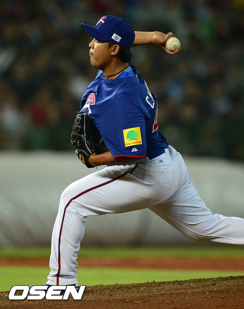 5일 오후 대만 타이중 인터컨티넨탈구장에서 2013 WBC 1라운드 B조 한국과 대만의 경기, 3회말 2사 1,2루 대만 두번째 투수 왕징밍이 역투하고 있다