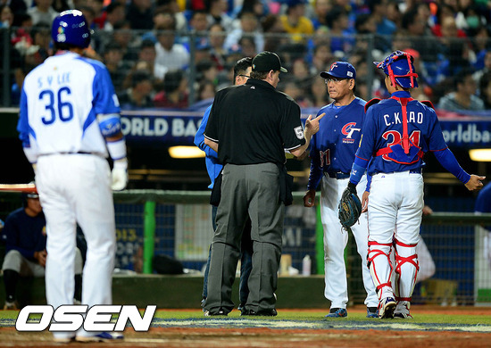 5일 오후 대만 타이중 인터컨티넨탈구장에서 2013 WBC 1라운드 B조 한국과 대만의 경기, 3회말 2사 1,2루 상황에서 대만 투수코치가 투수 교체를 위해 구심과 이야기를 나누고 있다
