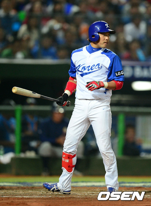 5일 오후 대만 타이중 인터컨티넨탈구장에서 2013 WBC 1라운드 B조 한국과 대만의 경기, 3회말 2사 양야오쉰의 사구에 맞은 이용규가 투수를 노려보고 있다.