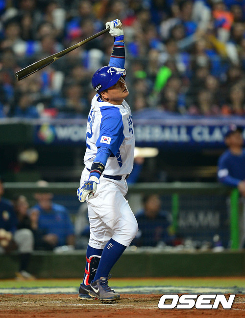 5일 오후 대만 타이중 인터컨티넨탈구장에서 2013 WBC 1라운드 B조 한국과 대만의 경기, 4회말 2사 만루에서 대타로 나온 김태균이 플라이를 치고 있다.