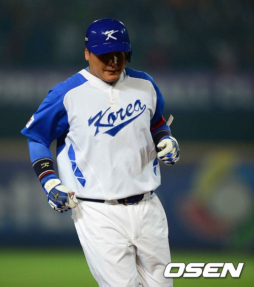 5일 오후 대만 타이중 인터컨티넨탈구장에서 2013 WBC 1라운드 B조 한국과 대만의 경기, 4회말 2사 만루 찬스를 놓친 대타 김태균이 아쉬운 표정으로 더그아웃으로 들어가고 있다