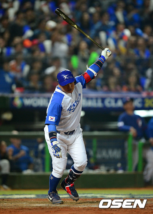 5일 오후 대만 타이중 인터컨티넨탈구장에서 2013 WBC 1라운드 B조 한국과 대만의 경기, 4회말 2사 만루에서 대타 김태균이 외야플라이 타구를 날린후 아쉬워하고 있다.