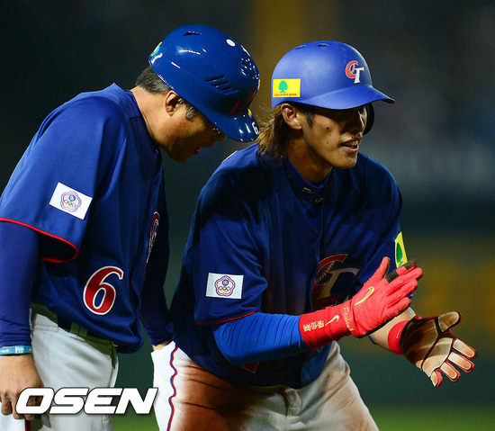 5일 오후 대만 타이중 인터컨티넨탈구장에서 2013 WBC 1라운드 B조 한국과 대만의 경기, 4회초 2사 2루 대만 양다이강이 1타점 적시타를 날린후 환호하고 있다. 양다이강은 2회 한국 수비 실책을 틈타 선취 득점 올렸다.
