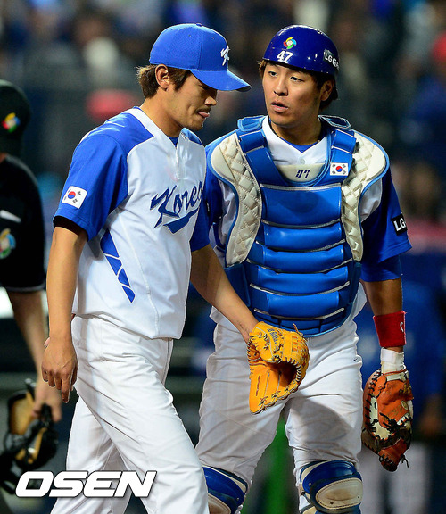 5일 오후 대만 타이중 인터컨티넨탈구장에서 2013 WBC 1라운드 B조 한국과 대만의 경기, 4회초 2사 2루 대만 양다이강에게 1타점 적시타를 허용한 노경은이 강민호 포수가 이야기를 나누고 있다