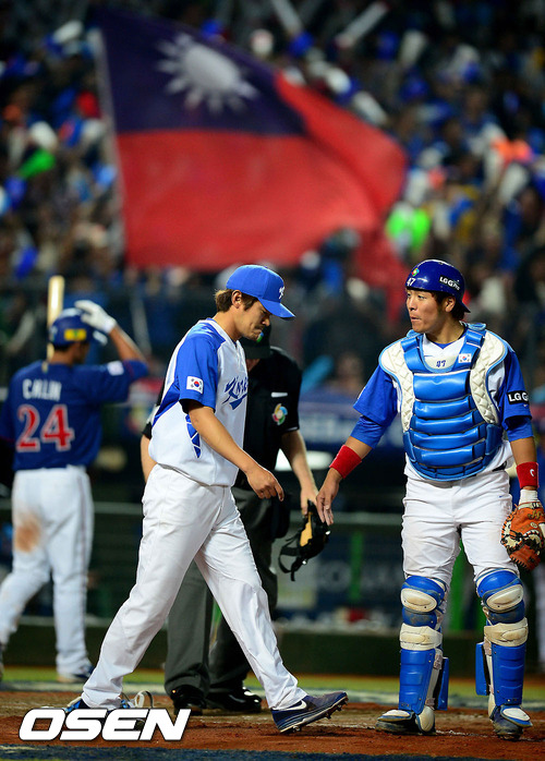 5일 오후 대만 타이중 인터컨티넨탈구장에서 2013 WBC 1라운드 B조 한국과 대만의 경기, 4회초 2사 2루 대만 양다이강에게 1타점 적시타를 허용한 노경은이 강민호 포수가 이야기를 나누고 있다
