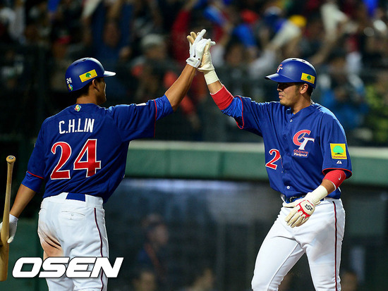 5일 오후 대만 타이중 인터컨티넨탈구장에서 2013 WBC 1라운드 B조 한국과 대만의 경기, 4회초 2사 2루 대만 양다이강의 1타점 적시타때 2루 주자 궈옌이 홈을 밟은 뒤 린즈셩과 하이파이브를 하고 있다