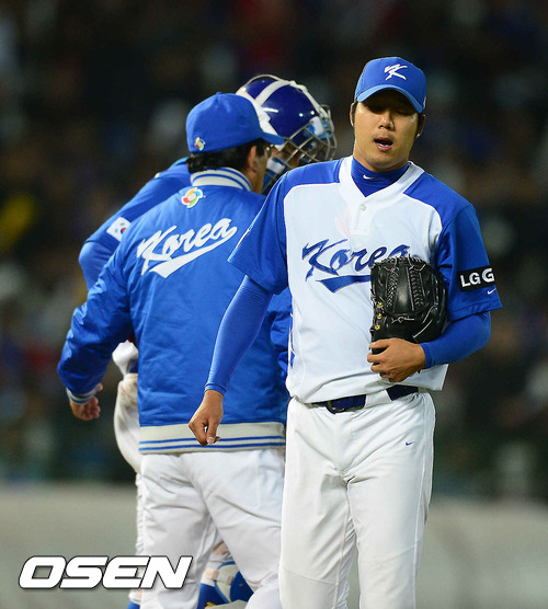 5일 오후 대만 타이중 인터컨티넨탈구장에서 2013 WBC 1라운드 B조 한국과 대만의 경기, 4회초 2사 2루 장원준 투수가 교체되며 아쉬워하고 있다
