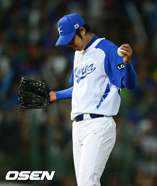 5일 오후 대만 타이중 인터컨티넨탈구장에서 2013 WBC 1라운드 B조 한국과 대만의 경기, 4회초 장원준 선발투수가 궈옌원에게 2루타를 허용후 아쉬워하고 있다.