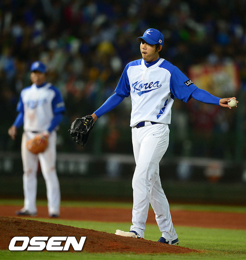 5일 오후 대만 타이중 인터컨티넨탈구장에서 2013 WBC 1라운드 B조 한국과 대만의 경기, 4회초 장원준 선발투수가 궈옌원에게 2루타를 허용후 아쉬워하고 있다.