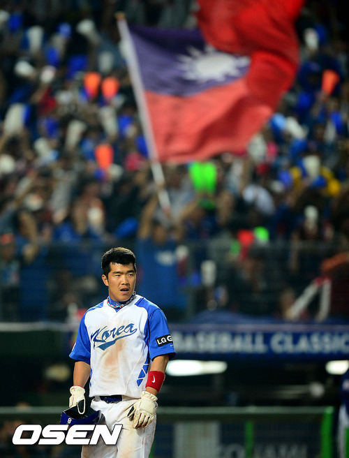 5일 오후 대만 타이중 인터컨티넨탈구장에서 2013 WBC 1라운드 B조 한국과 대만의 경기, 5회말 2사 1루 이대호의 안타때 1루 주자 정근우가 홈에서 태그아웃된 후 아쉬워하고 있다.