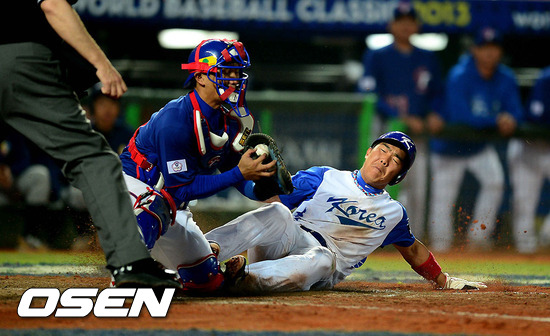 5일 오후 대만 타이중 인터컨티넨탈구장에서 2013 WBC 1라운드 B조 한국과 대만의 경기, 5회말 2사 1루 이대호의 안타때 1루 주자 정근우가 홈에서 태그아웃된 후 아쉬워하고 있다.