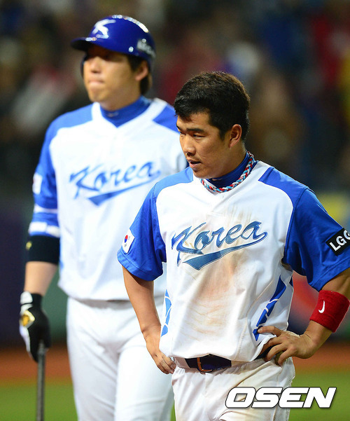 5일 오후 대만 타이중 인터컨티넨탈구장에서 2013 WBC 1라운드 B조 한국과 대만의 경기, 5회말 2사 1루 이대호의 안타때 홈에서 태그아웃된 정근우가 아쉬운 표정을 짓고 있다.