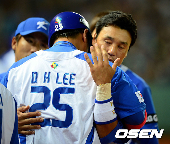 5일 오후 대만 타이중 인터컨티넨탈구장에서 2013 WBC 1라운드 B조 한국과 대만의 경기, 8회말 역전 홈런후 이대호와 이승엽이 포옹을 하고 있다.