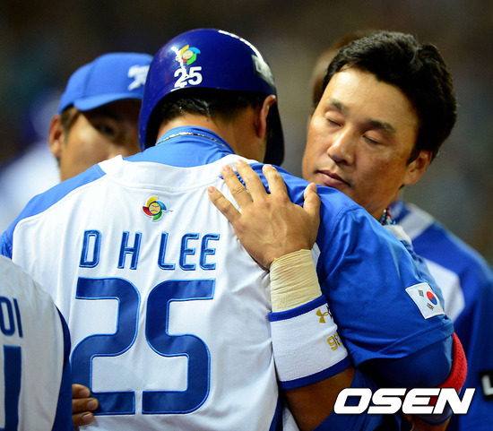 5일 오후 대만 타이중 인터컨티넨탈구장에서 2013 WBC 1라운드 B조 한국과 대만의 경기, 8회말 공격 종료 후 이대호와 이승엽이 포옹을 하고 있다.