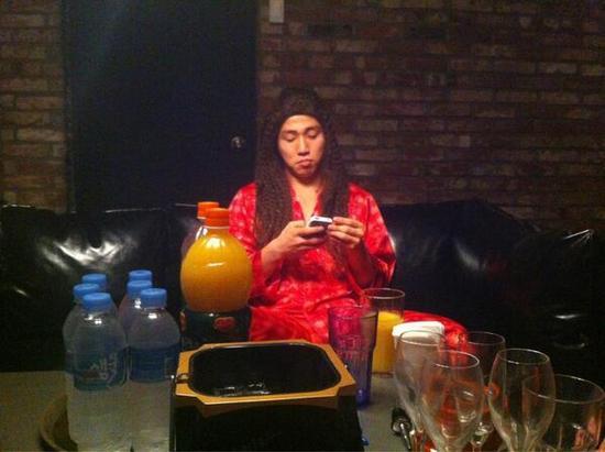 공개된 사진에는 그룹 UV 활동 때 착용하는 긴 레게머리 가발을 쓰고 붉은색 잠옷을 입은 유세윤의 모습이 담겨있다. 특히 유세윤은 잠옷을 입고 클럽에 앉아 있으면서도 아무 일도 없다는 표정으로 능청스런 태도를 보이고 있어 눈길을 끈다.