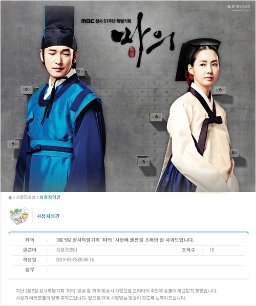 대전MBC는 6일 오전 홈페이지 시청자 게시판을 통해 “3월 5일 창사특별기획 ‘마의’ 시청에 불편을 초래한 점 사과드립니다”라는 제목의 사과글을 올렸다.