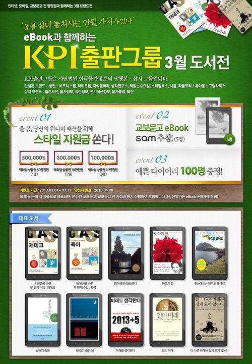 한국물가정보 KPI출판그룹(대표 노영현)이 3월 한 달간 교보문고 eBook과 함께하는 ‘이 책, 읽고 싶은 바람이 분다’ 도서 브랜드전을 연다.