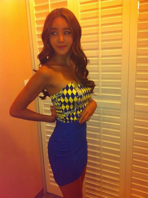 사진 속 김미연은 어깨가 짧은 튜브톱 원피스를 입고 옆으로 서서 군살 하나 없이 늘씬한 콜라병 몸매를 드러내고 있다. 그럼에도 "배가 나왔다"며 불만을 토로하는 그의 모습이 눈길을 끈다.