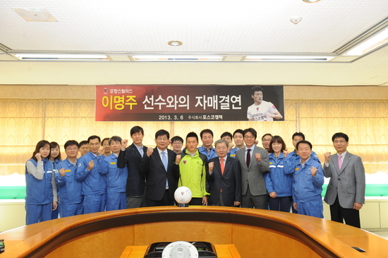 포스코켐텍은 올해 포항스틸러스 홈경기때마다 임직원들이 경기장을 찾아 이명주와 포항스틸러스를 응원하겠다는 뜻을 전했다.