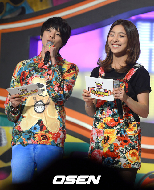 6일 오후 서울 유니클로 악스홀에서 진행된 MBC MUSIC '쇼 챔피언'에서 에프엑스 멤버 엠버와 루나가 진행을 하고 있다.