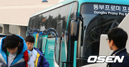 6일 오후 경기 일산동구 고양시 고양체육관에서 진행된 2012-2013 KB국민카드 프로농구 고양 오리온스와 원주 동부 경기, 경기에 앞서 동부 선수들이 구단 버스에서 내리고 있다.