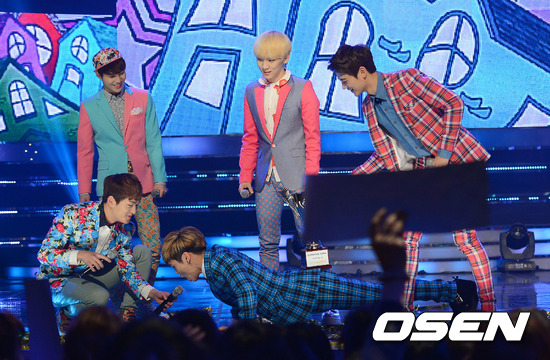 6일 오후 서울 유니클로 악스홀에서 진행된 MBC MUSIC '쇼 챔피언'에서 챔피언송을 차지한 샤이니가 1위 공약을 실천하고 있다.