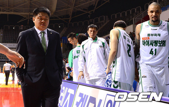 6일 오후 경기 일산동구 고양시 고양체육관에서 진행된 2012-2013 KB국민카드 프로농구 고양 오리온스와 원주 동부 경기, 2쿼터 종료 후 동부 강동희 감독이 고개를 숙인채 코트를 빠져나가고 있다
