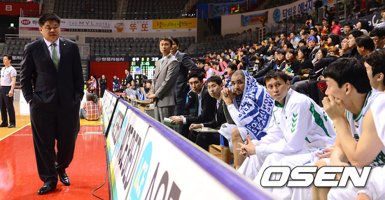 6일 오후 경기 일산동구 고양시 고양체육관에서 진행된 2012-2013 KB국민카드 프로농구 고양 오리온스와 원주 동부 경기, 2쿼터 동부 강동희 감독과 선수들이 어두운 표정을 짓고 있다