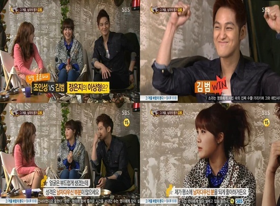 그는 이날 방송에서 조인성과 김범 중 이상형을 선택해 달라는 질문에 잠시 망설인 후 "김범이다"라고 답해 눈길을 끌었다.