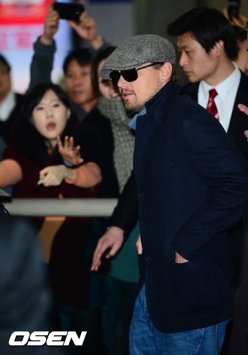 6일 저녁 김포공항을 통해 입국한 할리우드 배우 레오나르도 디카프리오가 팬들의 환호성을 듣고 있다.
