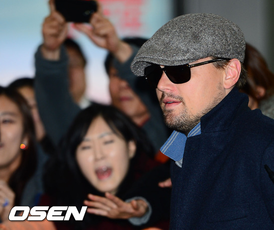 6일 저녁 김포공항을 통해 입국한 할리우드 배우 레오나르도 디카프리오가 팬들의 환호성을 듣고 있다.