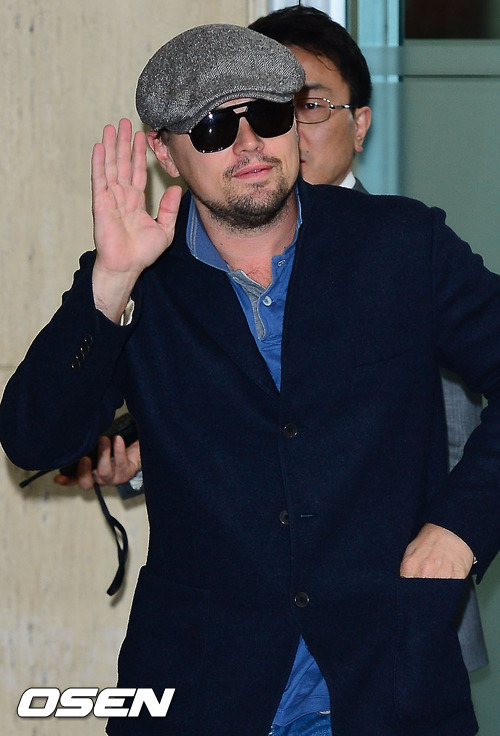 6일 저녁 김포공항을 통해 입국한 할리우드 배우 레오나르도 디카프리오가 입국장에서 팬들에게 인사를 하고 있다.