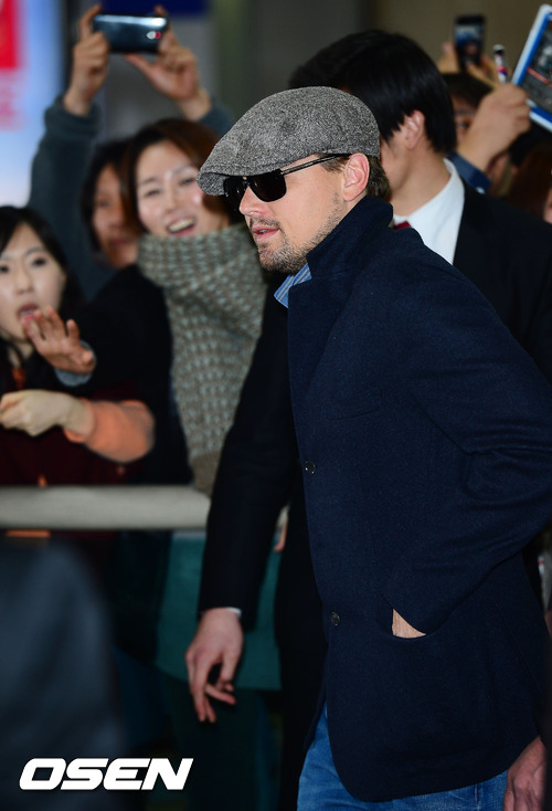 6일 저녁 김포공항을 통해 입국한 할리우드 배우 레오나르도 디카프리오가 팬들의 환호성을 듣고 있다.