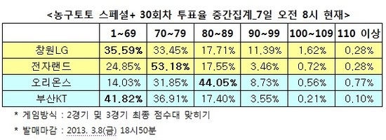 투표율을 살펴보면, 홈팀 오리온스는 80~89점대가 44.05%를 기록했고, 원정팀 KT는 69점 이하가 41.82%로 1순위를 차지했다.