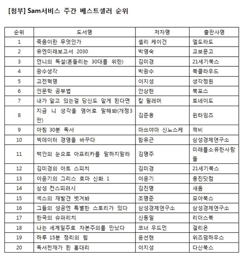 론칭 후 현재까지 sam 서비스로 가장 많이 읽은 책은 셸리 케이건 이다. 뒤를 이어 박영숙의 , 김미경의 , 박광수의 , 이지성의 순으로 자기계발, 인문, 문학 분야가 인기를 끌고 있다.