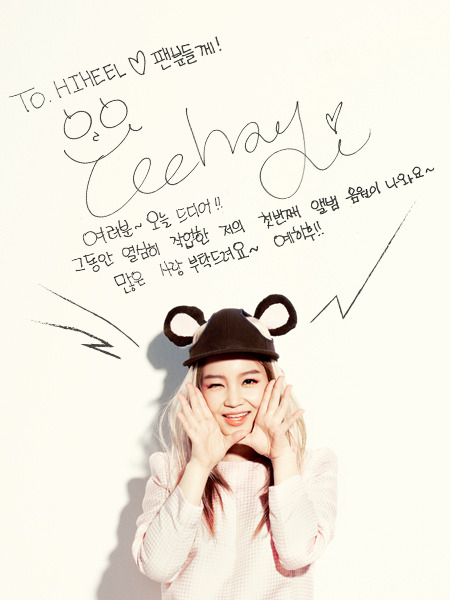 사진 속에는 이하이가 깜찍한 모자를 쓴 채 윙크를 하고 있는 모습이며 그 위로 자필로 쓴 메시지를 공개했다.