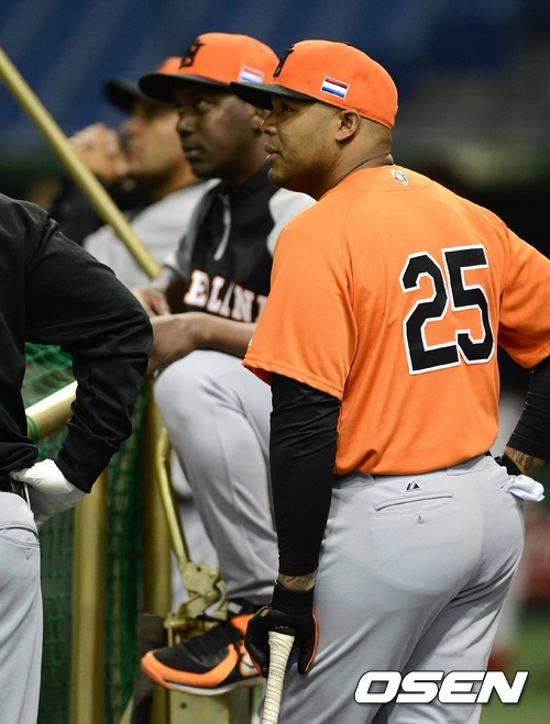 네덜란드 앤드루 존스가 타격 훈련을 하는 동료를 바라보고 있다.