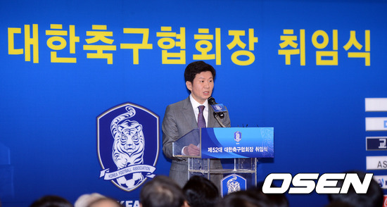 7일 오후 서울 신문로 축구회관에서 진행된 '제52대 정몽규 대한축구협회장의 취임식'에서 정몽규 대한축구협회장이 취임사를 하고 있다.