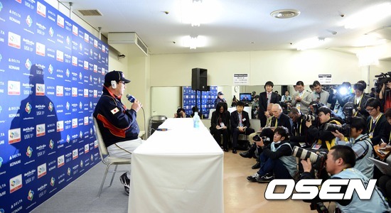 일본 야마모토 고지 감독이 기자회견에서 취재진의 질문에 답을 하고 있다.
