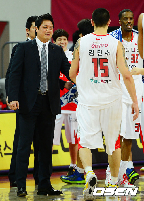 1쿼터 종료 후 SK 문경은 감독이 선수들과 하이파이브를 하고 있다.