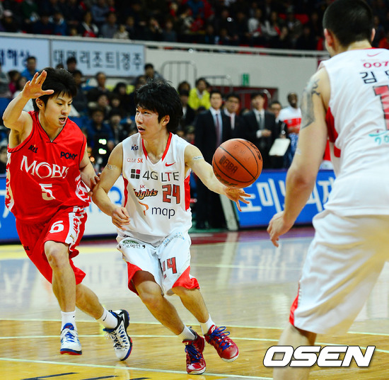 2쿼터 SK 정성수가 김민수에게 노룩패스를 연결하고 있다.