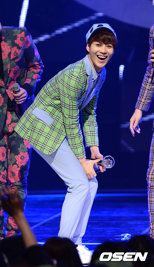 7일 오후 서울 상암동 CJ E&M에서 진행된 Mnet '엠카운트다운'(이하 엠카) 생방송에서 1위를 차지한 샤이니 태민이 트로피를 들고 세레머니를 하고 있다.