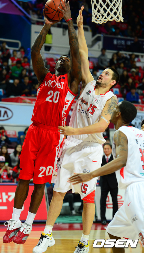 3쿼터 모비스 라틀리프가 SK 김민수의 블로킹을 피해 득점에 성공하고 있다.