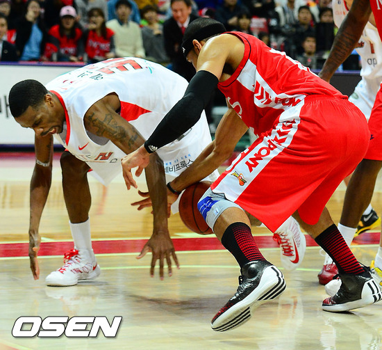 3쿼터 SK 헤인즈와 모비스 문태영이 볼다툼을 하고 있다.