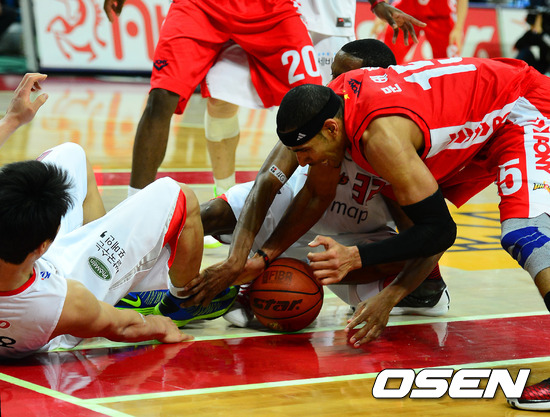 4쿼터 모비스 문태영이 SK 헤인즈와 볼다툼을 하고 있다.
