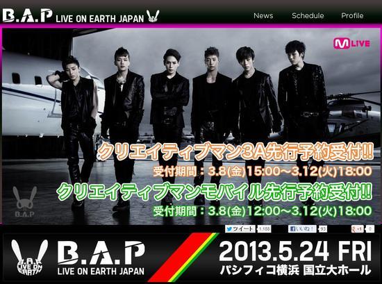 B.A.P의 소속사인 TS 엔터테인먼트는 8일 “B.A.P가 오는 5월 24일 일본 파시피코 요코하마 국립대 홀에서 5천 석 규모의 첫 단독 콘서트 ‘B.A.P 라이브 온 얼스 재팬(LIVE ON EARTH JAPAN)'을 개최한다”고 밝혔다.